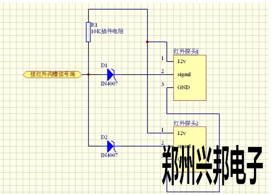 將每個二極管(IN4007)的負極和對應的探頭信號端相連之后,再將每個二極管(IN4007)的正極擰到一起再與紅外溝槽的信號端相連。