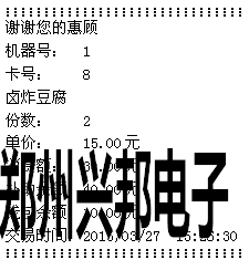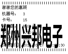 計算模式:輸入扣費金額,按[確認]鍵后,將卡片放于刷卡區,即可進行扣費,若連接的有打印機,可直接打印消費明細,打印出的信息如下圖所示: