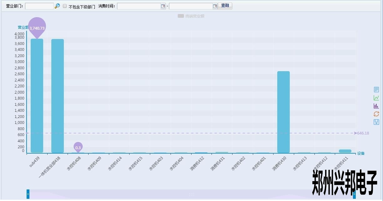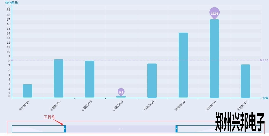 這是一個柱狀的數據圖表,展示了各個終端在所查詢時間內的營業情況,那么最下面的那條橫杠是什么呢?其實那是一個工具條,用來集中顯示某個具體的柱狀數據,如水控機409以及后面的幾個數據都看不大清楚,想要拉近一點看看,怎么做呢,很簡單,只要拉動最下面的工具條就好了,就像這樣: