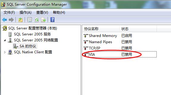 4、打開(kāi)SQL Server 2005中的配置工具SQL Server Configure Manager,將VIA協(xié)議禁用