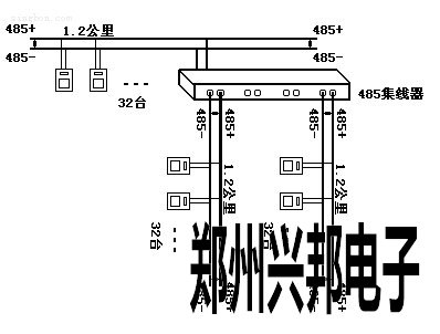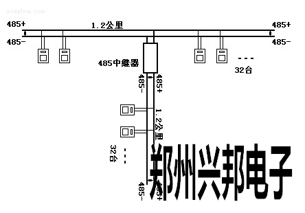 利用485中繼器或485集線器,可以將一個大型485網絡分隔成若干個網段。485中繼器或485集線器就如同485網段之間連接的"橋梁"。當然每個網段還是遵循上面的485規范,即1.2公里長度,32個節點數。